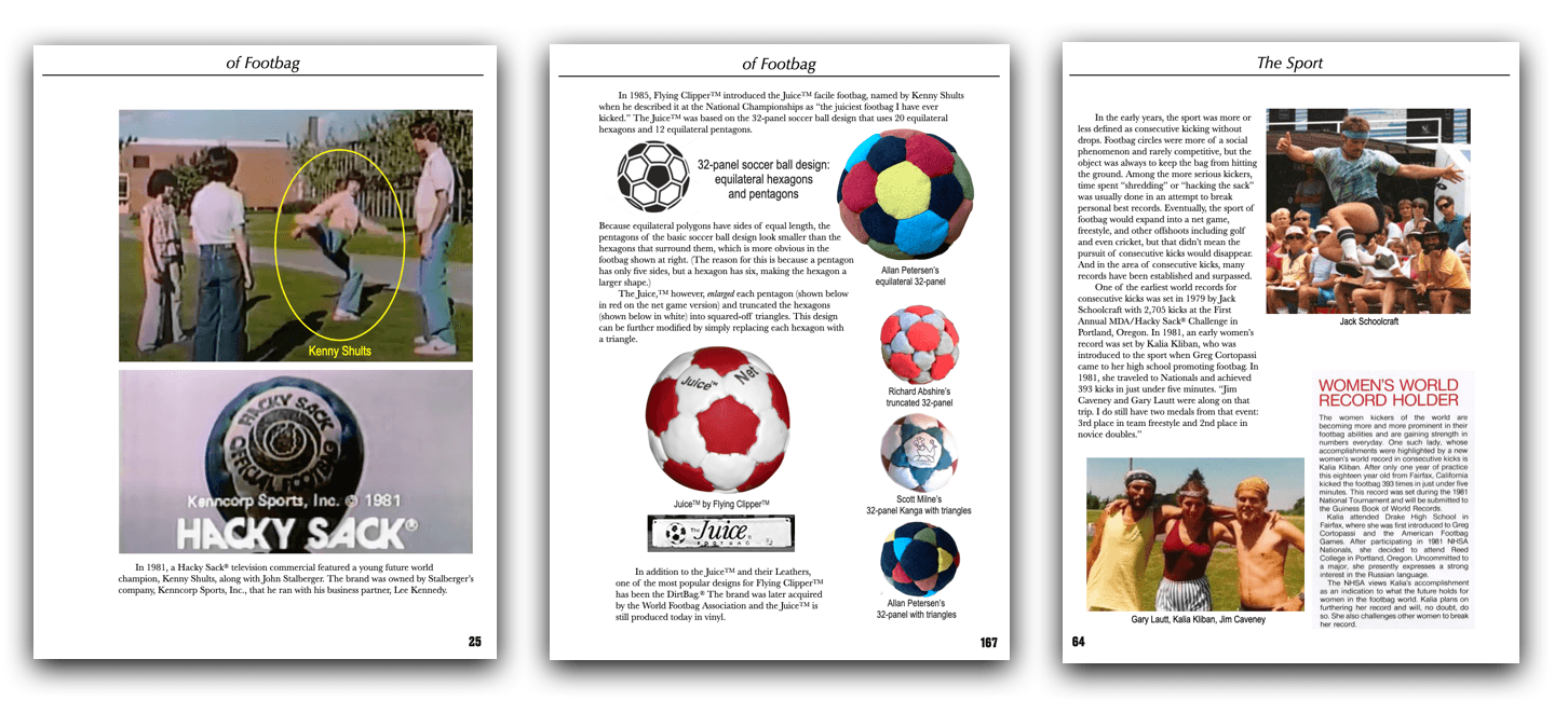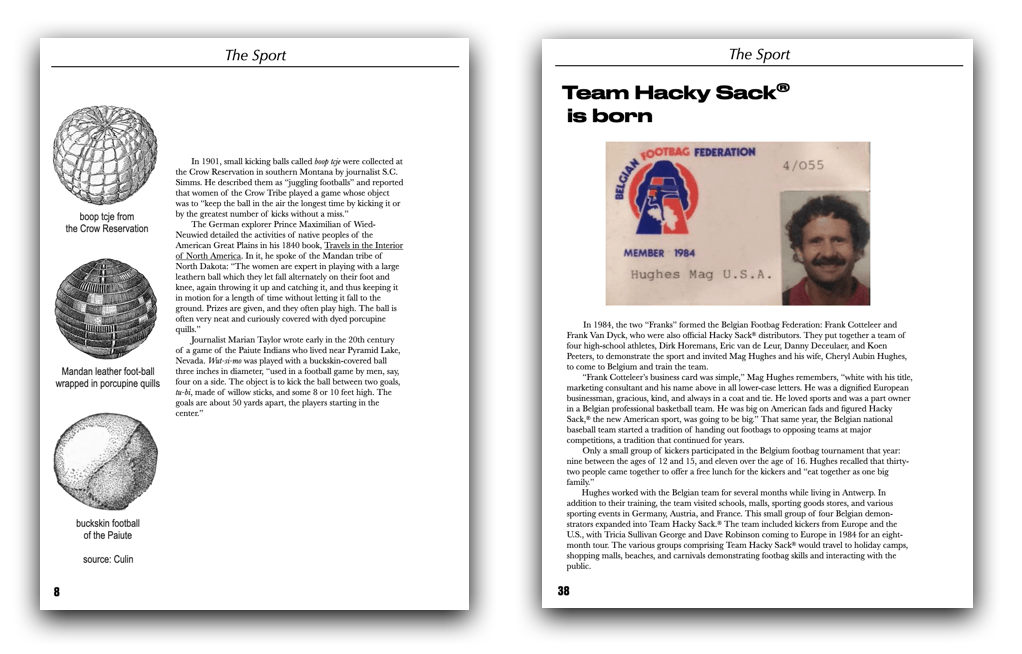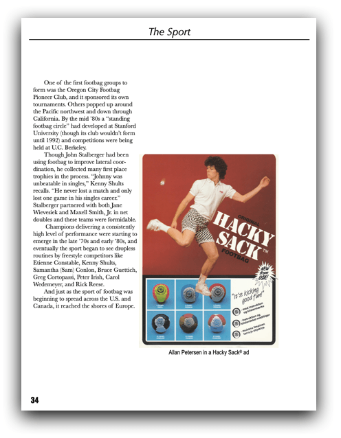 Our book covers the early days of footbag, but it also covers the really early days, as a pasttime among indigenous peoples that goes back hundreds of years. However, the scope is limited primarily to those years between 1972 and 2000, from when Mike Marshall and John Stalberger first toyed with the concept of the Hacky Sack® through the formation of Team Hacky Sack® under the leadership of Scott "Mag" Hughes, and then onto the Footbag Hall of Fame. The key founders and kickers are honored in the beginning, with some of the most successful being highlighted throughout the book.