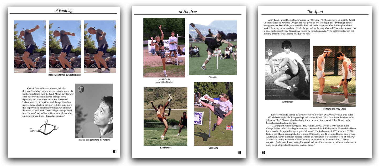 The Sport of Footbag takes readers from the spontaneous kicking circles that sprang up in city parks all the way to the organized tournaments and, eventually, world championships. It talks technical differences between freestyle and the net game, its rules of play, and the early tricks that evolved from practice and experimentation.